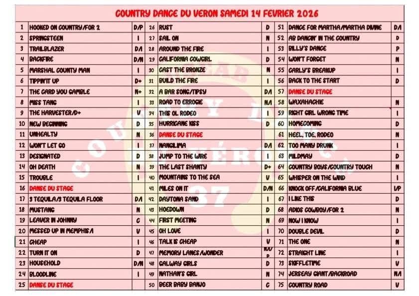 « Tous les Évènements Samedi 14/02/2026 à Beaumont en Véron (37) 14 février 2026 à 20 h 00 « Samedi 7/02/2026 : Notre Bal Carnaval COUNTRY ATTITUDE à Chouzé-sur-Loire (37 proche 49) Samedi 21/02/2026 a Varennes/Loire (49) » Ajouter au calendrier Google Agenda iCalendar Outlook 365 Outlook Live Détails Date : 14 février 2026 Heure : 20 h 00 Catégorie d’Évènement: AGENDA Organisateur USEAB COUNTRY DANCE DU VERON Lieu salle des fêtes de BEAUMONT EN VERON (37) salle des fêtes BEAUMONT EN VERON, France + Google Map